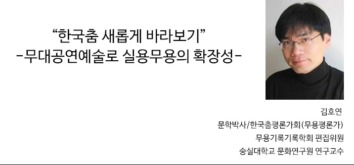 그러나 이번 비평문은 실용무용열의 공연에 접근하여 대중성과 시대성을 겸비한 새로운 춤의 가치와 가능성을 평가받는 다는데 한 발짝 다가가는 일이라 생각하며 그 시작을 과감히 부탁드렸다.