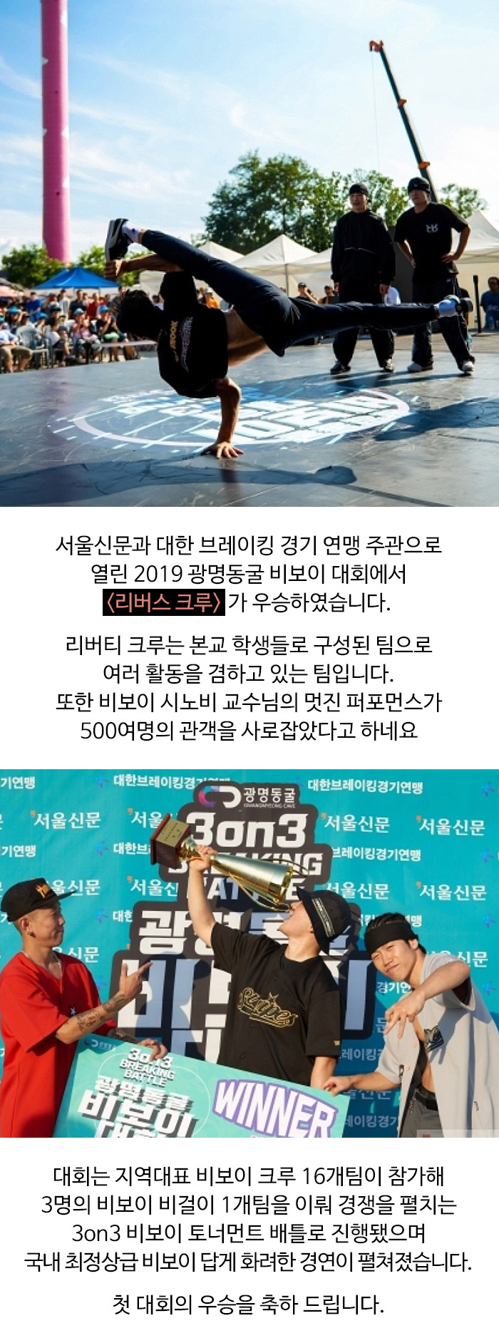 서울신문과 대한 브레이킹 경기 연맹 주관으로 열린 2019 광명동굴 비보이 대회에서 <리버스 크루>가 우승하였습니다.