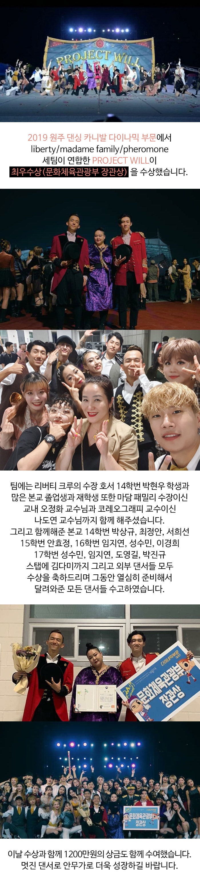 2019 원주 댄싱 카니발 다이나믹 부문에서 liberty / madame family / pheromone 세팀이 연합한 PROJECT WILL이 최우수상(문화체육관광부 장관상)을 수상했습니다.
