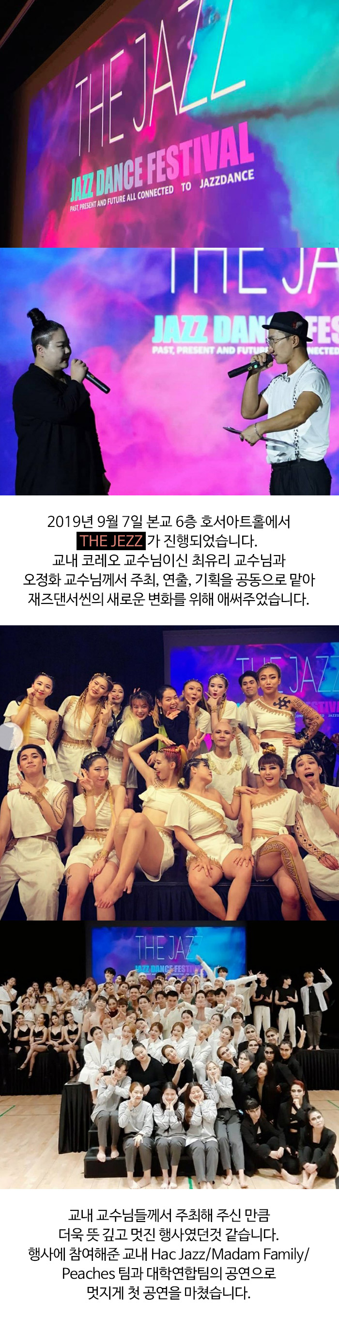 교내 코레오 교수님이신 최유리 교수님과 오정화 교수님께서 주최, 연출, 기획을 공동으로 맡아 재즈댄서씬의 새로운 변화를 위해 애써주었습니다.