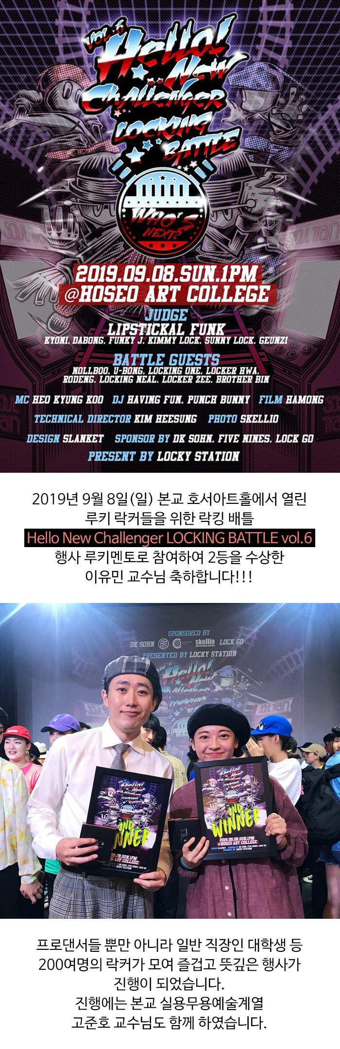 2019년 9월 8일(일) 본교 호서아트홀에서 열린 루키 락커들을 위한 락킹 배틀 Hello New Challenger LOCKING BATTLE vol.6 행사 루키멘토로 참여하여 2등을 수상한 이유민교수님 축하합니다!!!