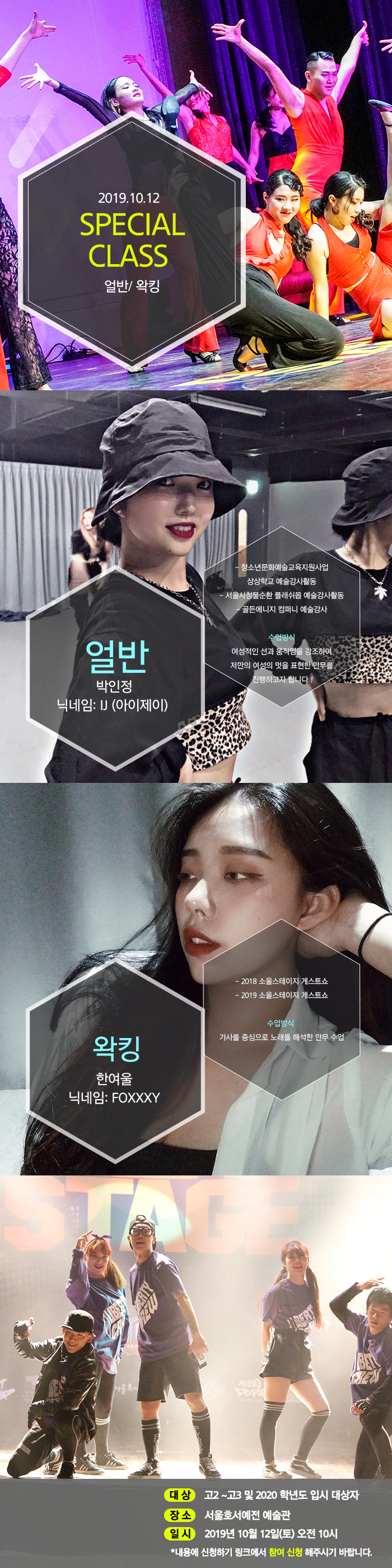 실용무용 체험학교가 오는 10월 12일(토) 오전 10시에 진행합니다. 참여하신 분들께 수료증을 드립니다. 얼반, 왁킹에 관심있는 청소년들의 많은 참여 바랍니다.