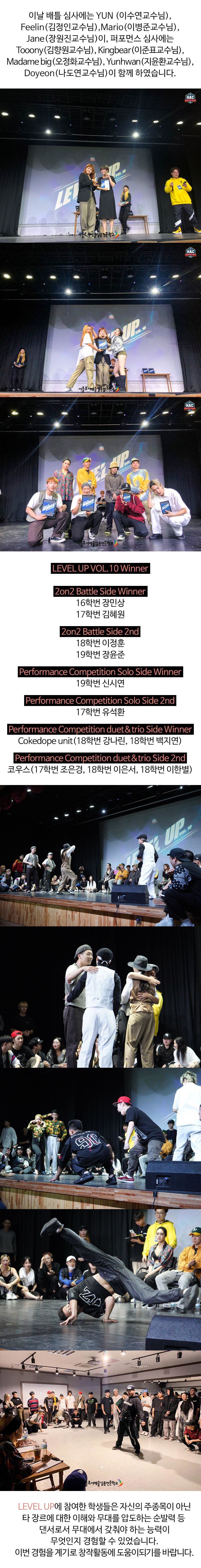 레벨업은 실용무용예술계열 내에 교육하는 모든 장르를 이해하고 재학생들이 한 단계 성장할 수 있는 계기를 주는 대회로 자신과 전혀 다른 장르의 학생과 배틀을 하게 되는 형식으로 진행되는 2on2 battle 배틀과 개인/팀으로 나뉘는 퍼포먼스 대회가 진행되었습니다.