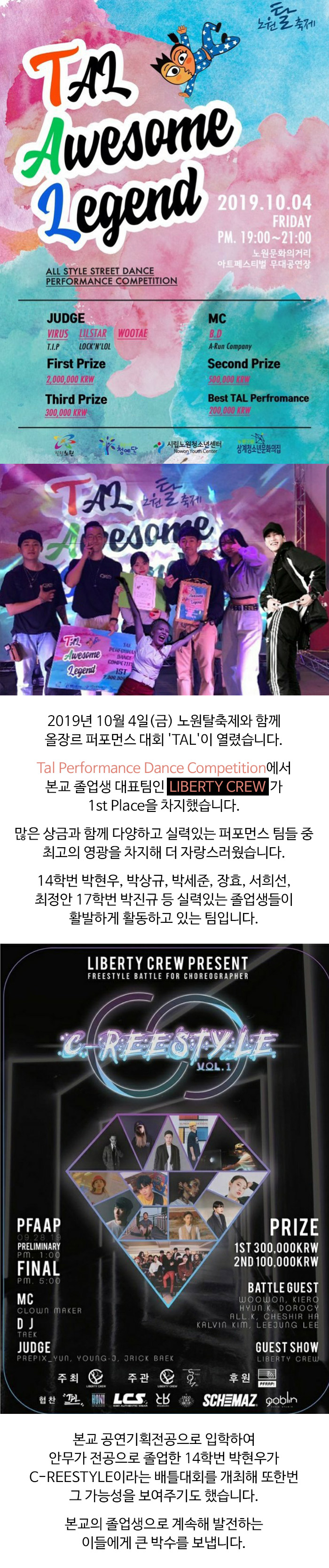 실용무용예술계열 LIBERTY CREW 올장르 퍼포먼스 대회 'TAL' 우승소식 및 C-REESTYLE 개최 소식