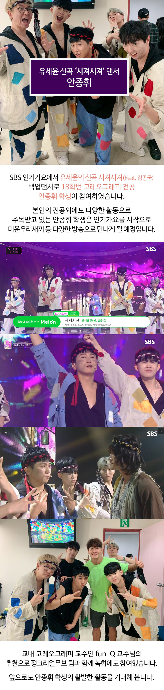 SBS 인기가요에서 유세윤의 신곡 시져시져 (Feat. 김종국) 백업댄서로 18학번 코레오그래피 전공 안종휘 학생이 참여하였습니다.