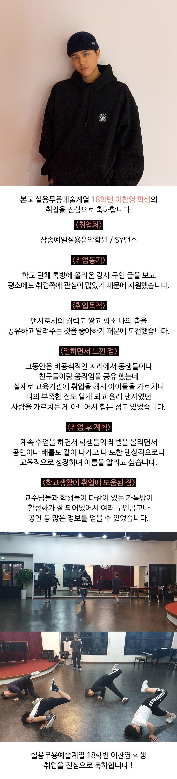 실용무용예술계열 18학번 이찬영 학생 취업을 진심으로 축하합니다!