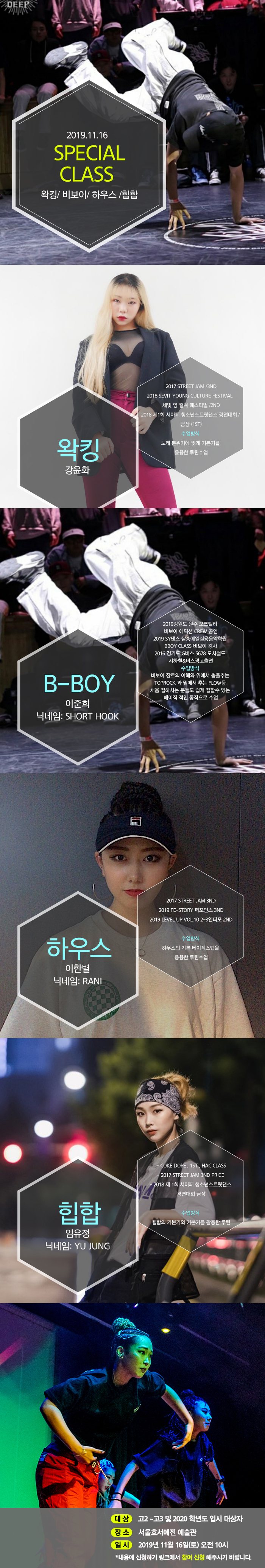 실용무용 체험학교가 오는 11월 16일(토) 오전 10시에 진행합니다. 참여하신 분들께 수료증을 드립니다. -왁킹, 비보이, 하우스, 힙합에 관심있는 청소년들의 많은 참여 바랍니다.