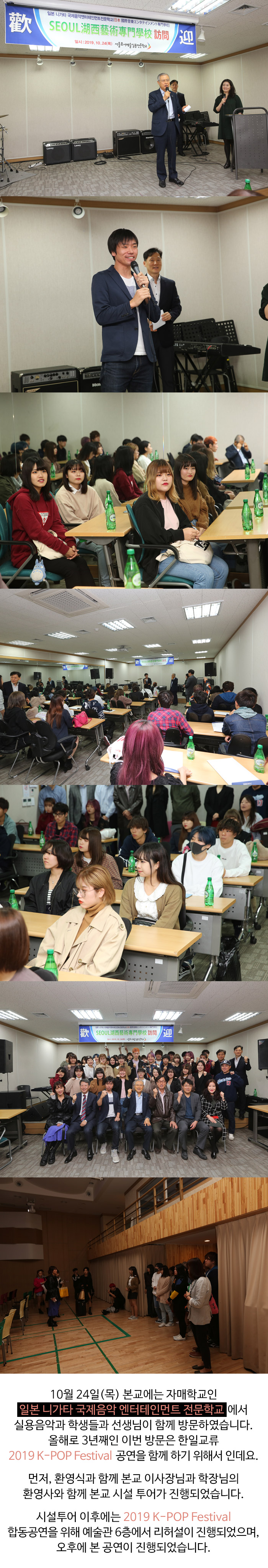 10월 24일(목) 본교에는 자매학교인 일본 니가타 국제음악 엔터테인먼트 전문학교에서 실용음악과 학생들과 선생님이 함께 방문하였습니다.