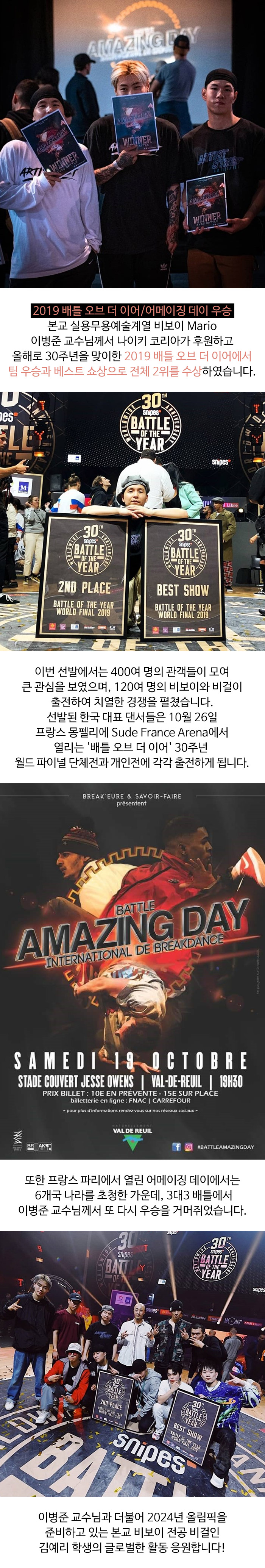 본교 실용무용예술계열 비보이 Mario 이병준 교수님께서 나이키 코리아가 후원하고 올해로 30주년을 맞이한 2019 배틀 오브 더 이어에서 팀 우승과 베스트 쇼상으로 전체 2위를 수상하였습니다.