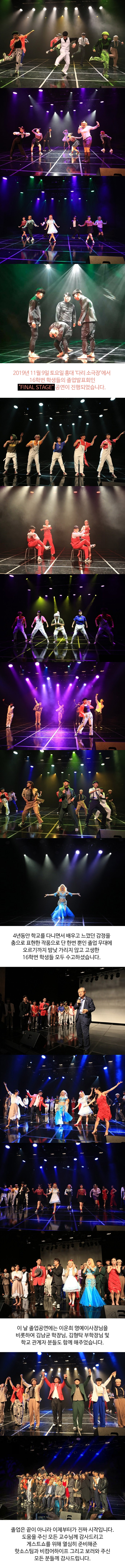 2019년 11월 9일 토요일 홍대 다리 소극장에서 16학번 학생들의 졸업발표회인 "FINAL STAGE" 공연이 진행되었습니다.