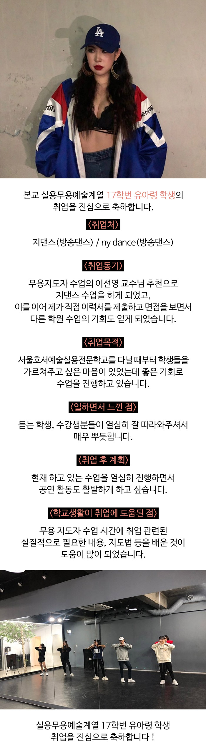 실용무용예술계열 17학번 유아령 학생의 취업 소식입니다. 취업을 진심으로 축하합니다!