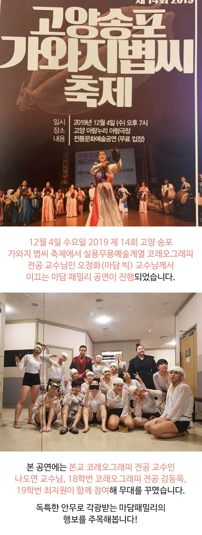 12월 4일 수요일 2019 제 14회 고양 송포 가와지 볍씨 축제에서 실용무용예술계열 코레오그래피 전공 교수님인 오정화(마담 빅) 교수님께서 이끄는 마담 패밀리 공연이 진행되었습니다.