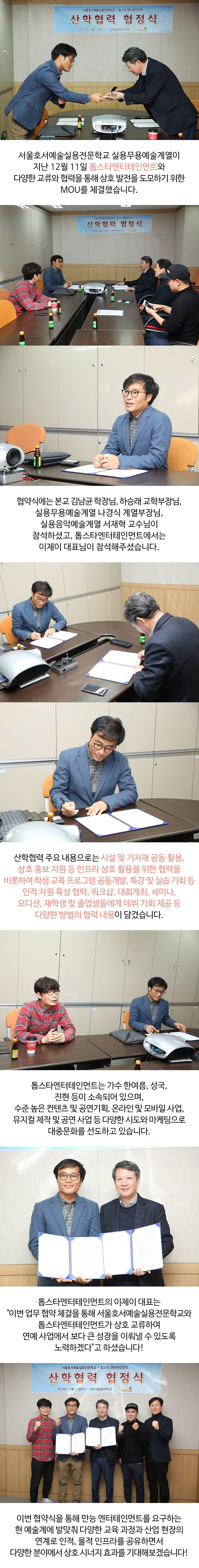 서울호서예술실용전문학교 실용무용예술계열에서는 지난 12월 11일 톱스타엔터테인먼트와 다양한 교류와 협력을 통해 상호 발전을 도모하기 위한 MOU를 체결했습니다.