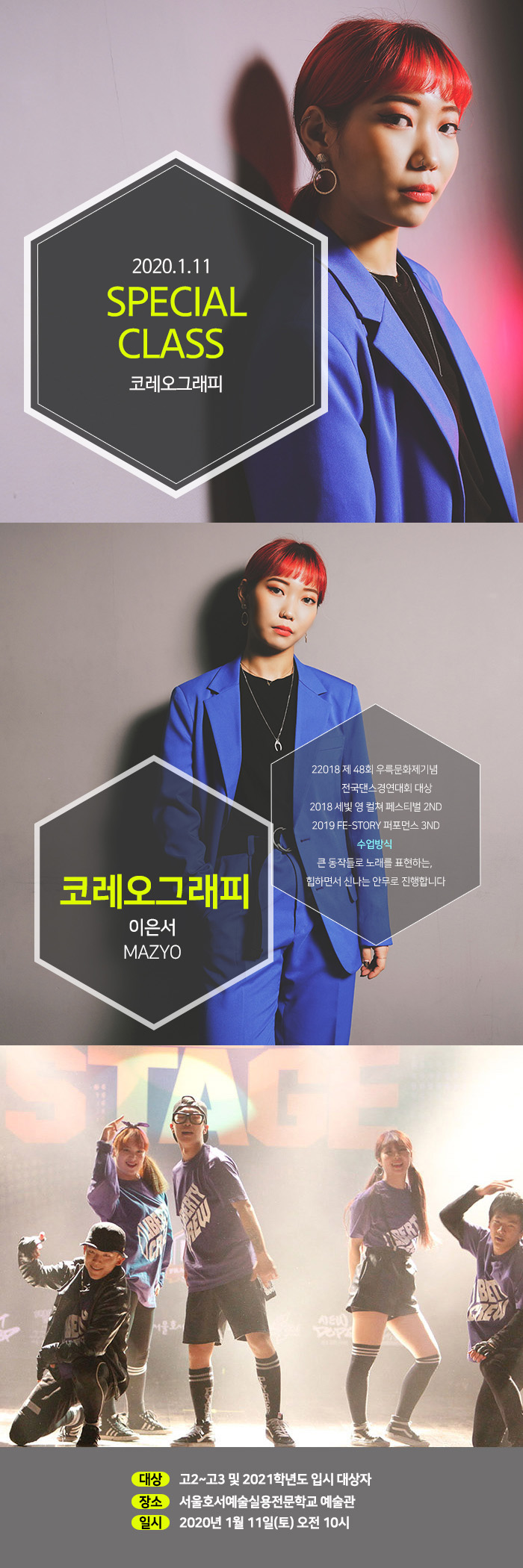 실용무용 체험학교가 오는 1월 11일(토) 오전 10시에 진행합니다. 참여하신 분들께 수료증을 드립니다. 코레오그래피에 관심있는 청소년들의 많은 참여 바랍니다.