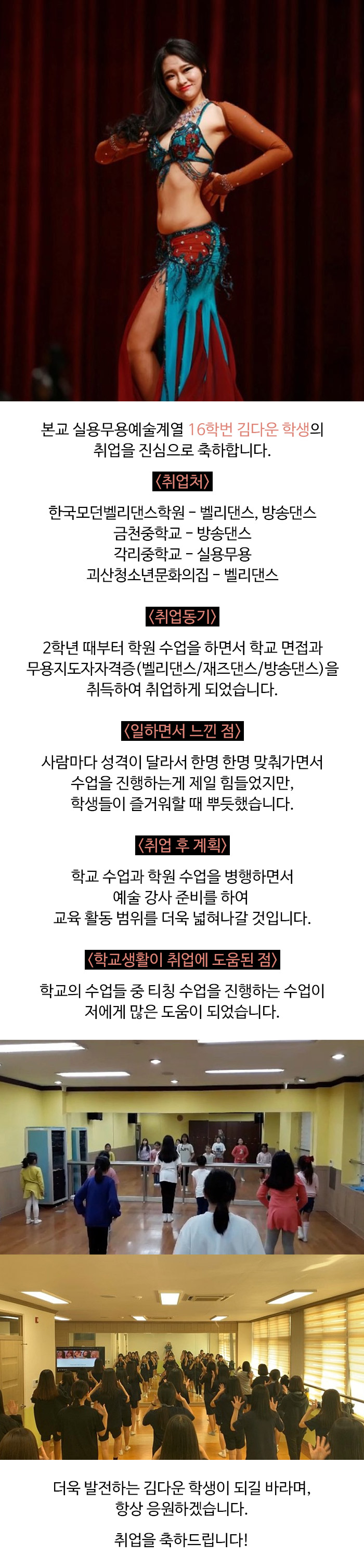 실용무용예술계열 16학번 김다운 학생의 취업 소식입니다.