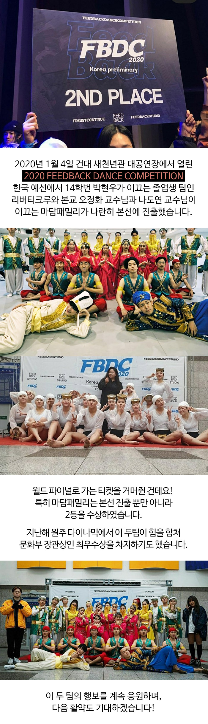 2020년 1월 4일 건대 새천년관 대공연장에서 열린 2020 FEEDBACK DANCE COMPETITION 한국 예선에서 14학번 박현우가 이끄는 졸업생 팀인 리버티크루와 본교 오정화 교수님과 나도연 교수님이 이끄는 마담패밀리가 나란히 본선에 진출했습니다.