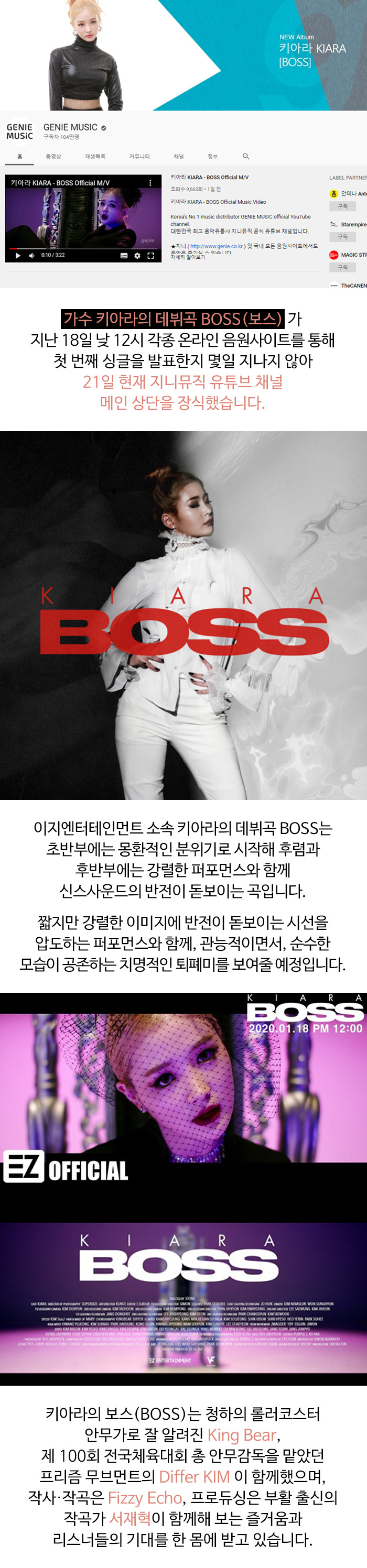 가수 키아라의 데뷔곡 BOSS(보스)가 지난 18일 낮 12시 각종 온라인 음원사이트를 통해 첫 번째 싱글을 발표한지 몇일 지나지 않아 21일 현재 지니뮤직 유튜브 채널 메인 상단을 장식해 화제가 되고 있습니다.