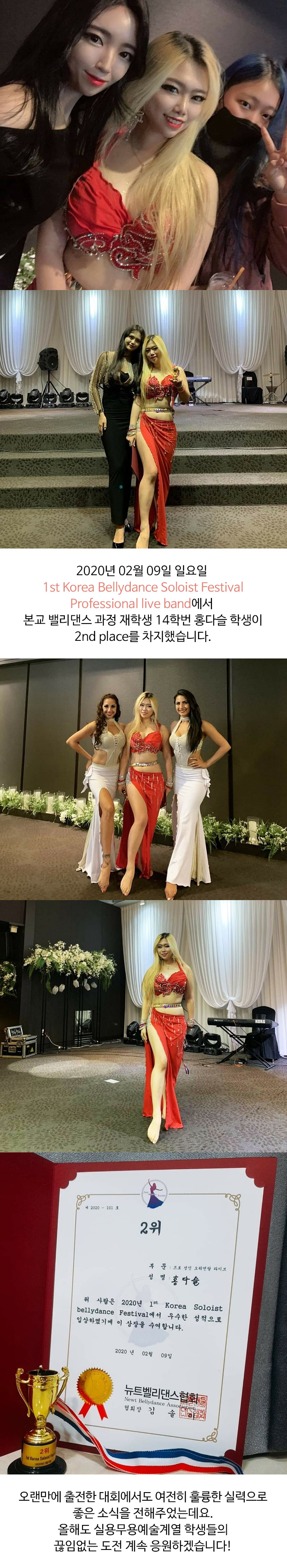 2020년 02월 09일 1st Korea Bellydance Soloist Festival Professional live band에서 본교 밸리댄스 과정 재학생 14학번 홍다슬 학생이 2nd place를 차지했습니다.