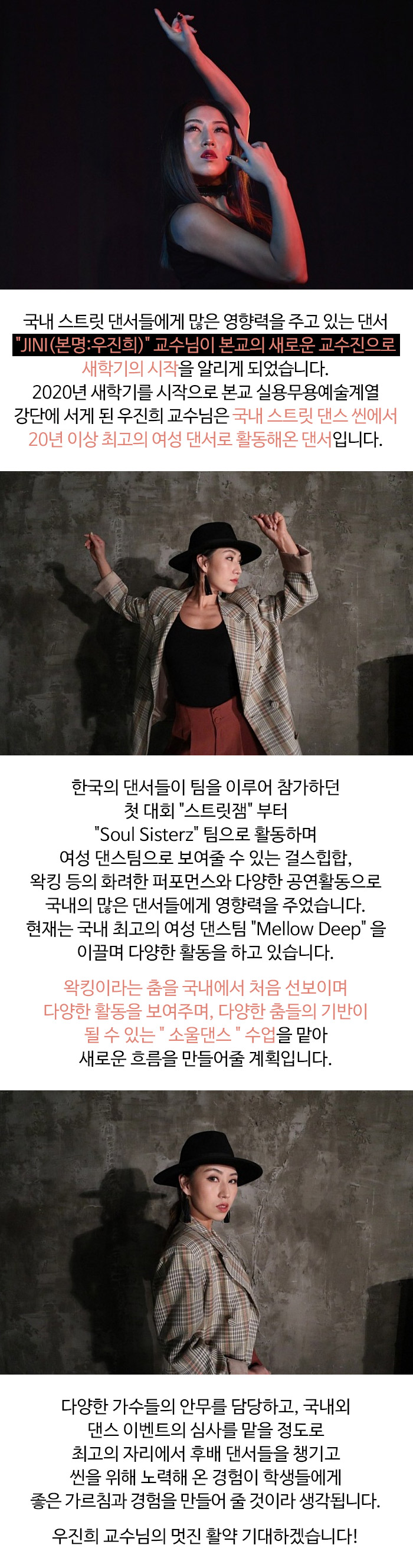 국내 스트릿 댄서들에게 많은 영향력을 주고 있는 댄서 "JINI(본명:우진희)" 교수님이 본교의 새로운 교수진으로 새학기의 시작을 알리게 되었습니다.