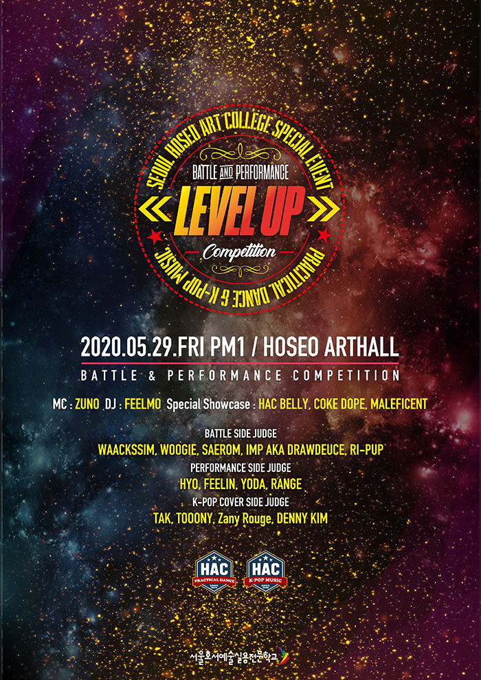 레벨업 VOL.11은 All Style Battle & Choreo, K-pop Performance 로 2020년 5월 29일 금요일 오후1시에서 오후7시까지 본교 6층 대강당에서 열립니다. 많은 관람 바랍니다.