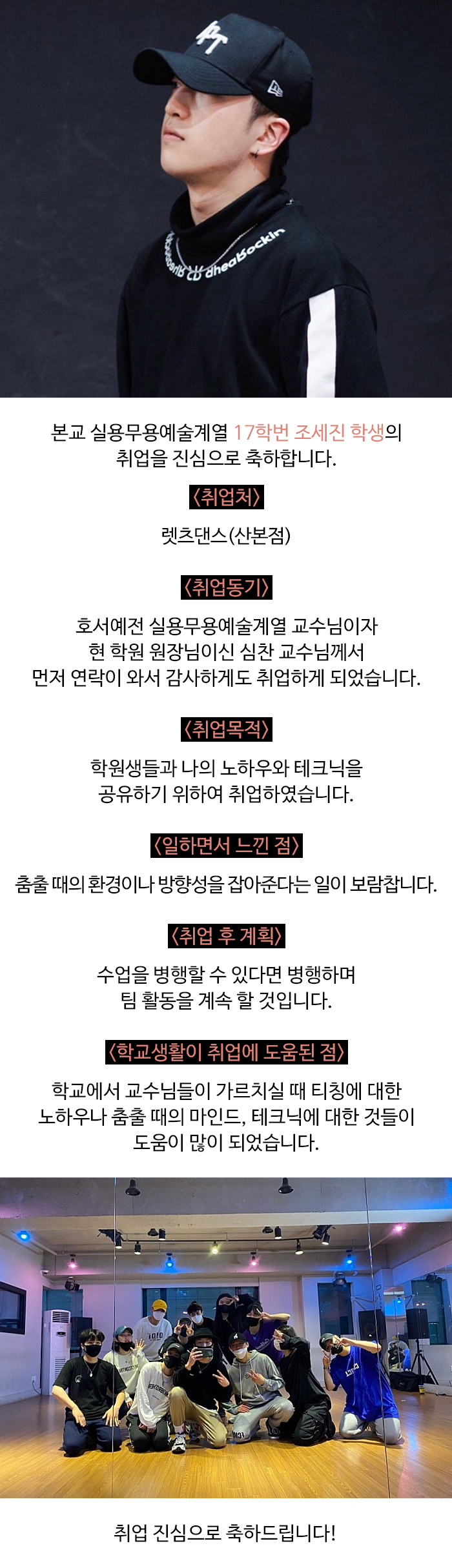 실용무용예술계열 17학번 조세진 학생 취업 소식입니다. 취업을 진심으로 축하드립니다!