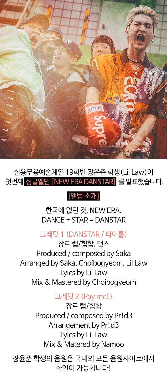 실용무용예술계열 19학번 장윤준 학생(Lil Law)의 첫번째 디지털 싱글 'NEW ERA DANSTAR'이 발매되었습니다.