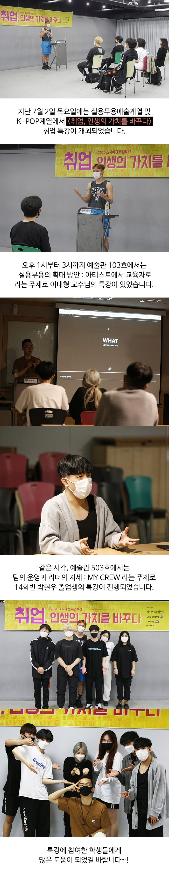 지난 7월 2일 목요일에는 실용무용예술계열 및 K-POP계열에서 '취업, 인생의 가치를 바꾸다' 취업 특강이 개최되었습니다.