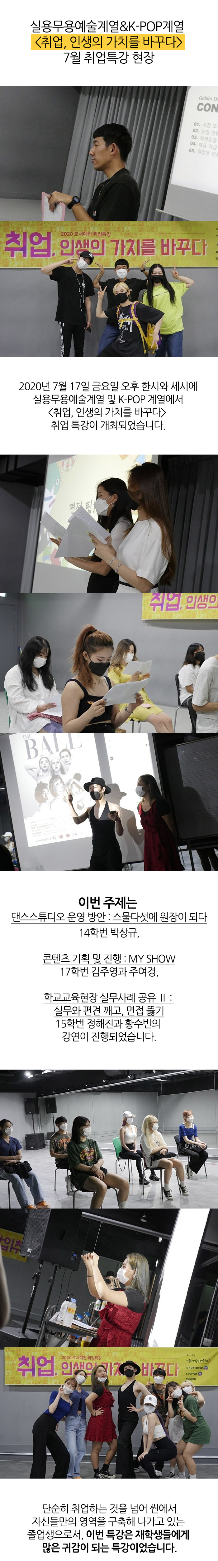 2020년 7월 17일 금요일 실용무용예술계열 및 K-POP 계열에서 <취업, 인생의 가치를 바꾸다> 취업 특강이 개최되었습니다.