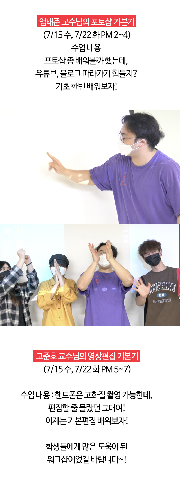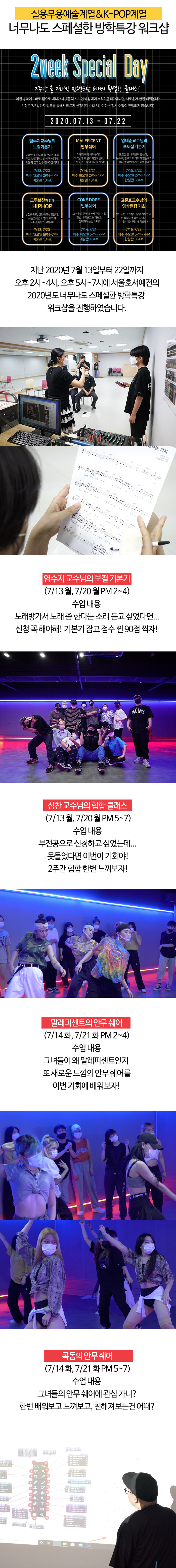 실용무용예술계열과 케이팝계열에서는 7월13일부터 22일까지 너무나도 스페셜한 방학특강 워크샵을 아래와 같이 진행하였습니다.