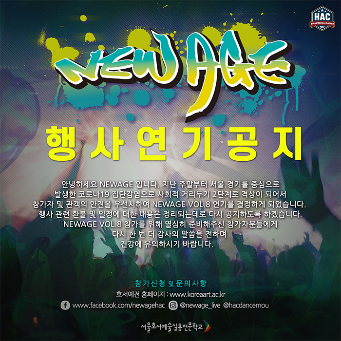 안녕하세요 NEWAGE입니다. 지난 주말부터 서울,경기를 중심으로 발생한 코로나19 집단감염으로 사회적 거리두기 2단계로 격상이 되어서 참가자 및 관객의 안전을 우선시하여 NEWAGE VOL.8 연기를 결정하게 되었습니다.