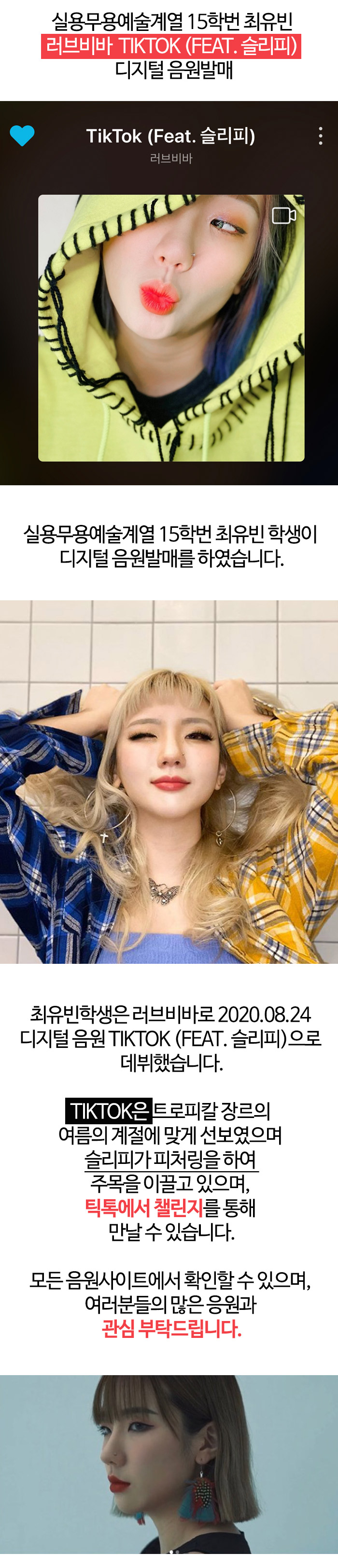 본교 실용무용예술계열 최유빈학생이 러브비바로 2020.08.24 디지털 음원 TikTok (Feat. 슬리피)으로 데뷔했습니다.