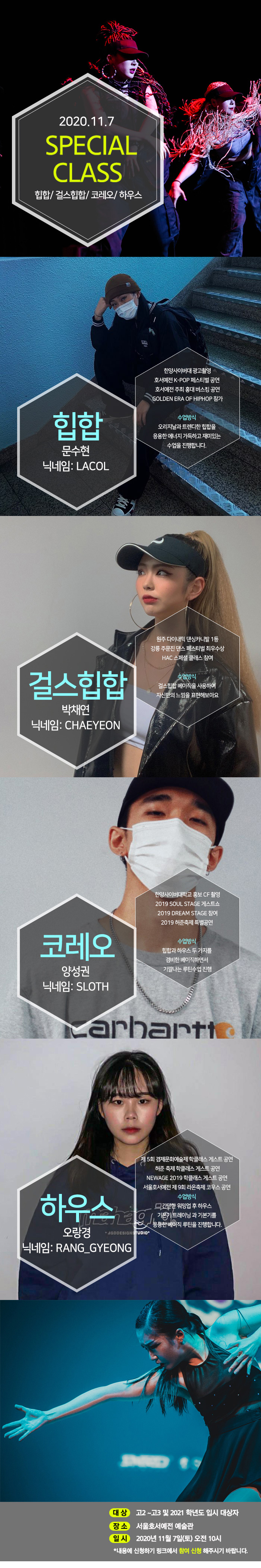 실용무용 체험학교가 오는 11월 7일(토) 오전 10시에 진행합니다. 참여하신 분들께 수료증을 드립니다. 힙합, 걸스힙합, 코레오, 하우스에 관심있는 청소년들의 많은 참여 바랍니다.