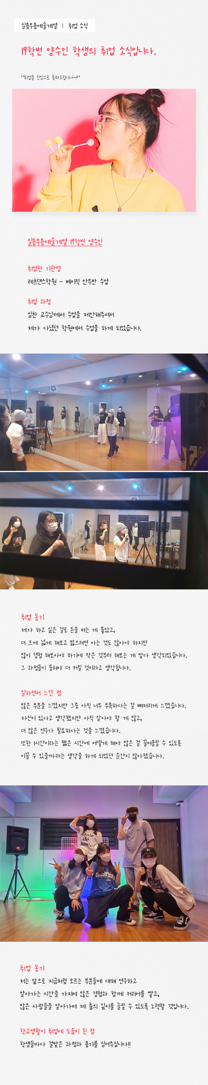 실용무용예술계열 19학번 양수인 학생 취업 소식