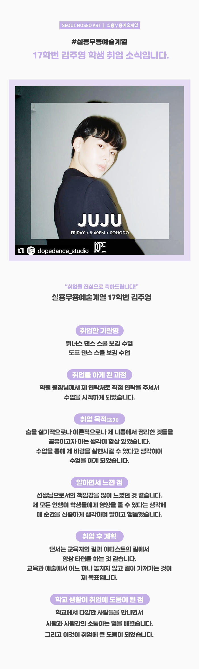 실용무용예술계열 17학번 김주영 학생 취업 소식