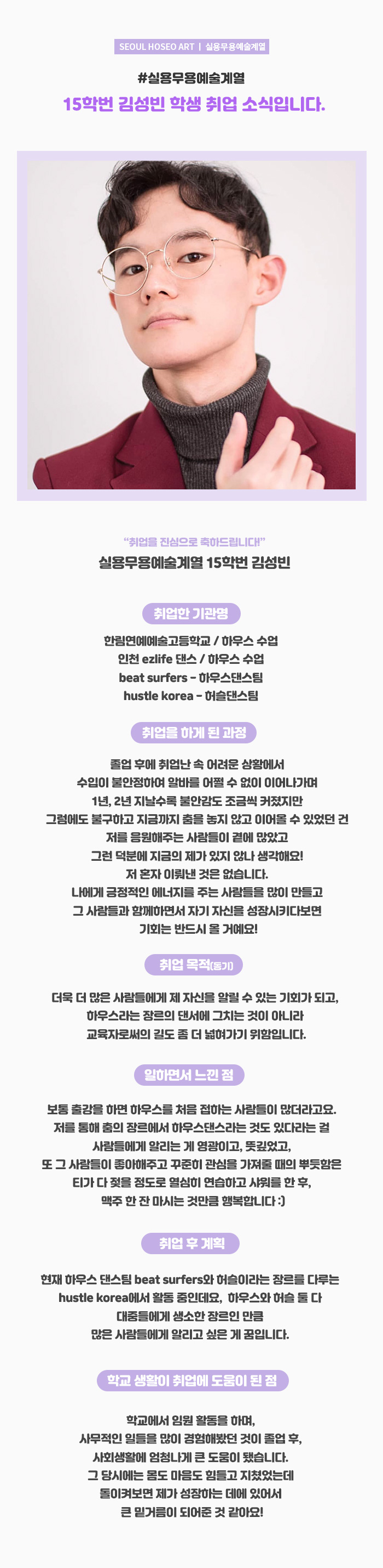 실용무용예술계열 15학번 김성빈 학생 취업 소식