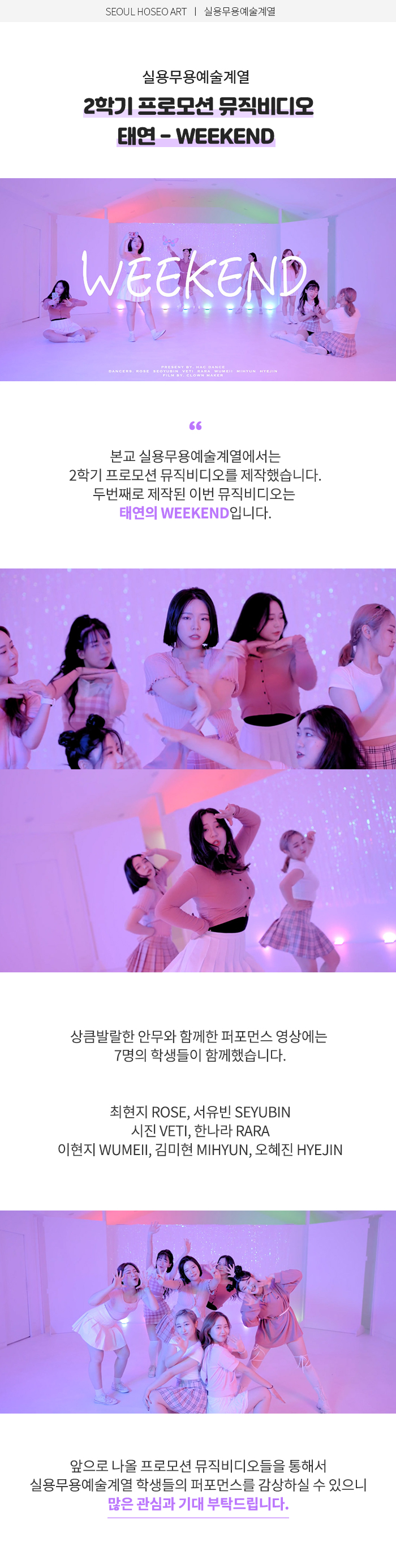 본교 실용무용예술계열에서는 2학기 프로모션 뮤직비디오를 제작했습니다. 두번째로 제작된 이번 뮤직비디오는 태연의 WEEKEND입니다.