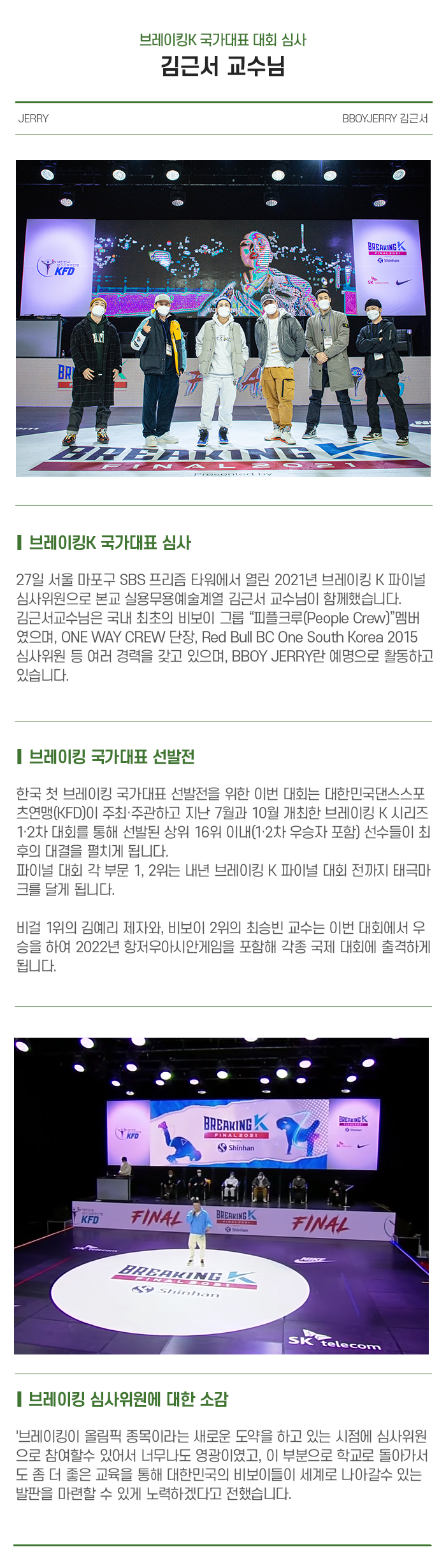 27일 서울 마포구 SBS 프리즘 타워에서 열린 2021년 브레이킹 K 파이널 심사위원으로 서울호서예술실용전문학교, 서울호서예전, 호서예전 실용무용예술계열 김근서 교수가 함께했습니다. 김근서교수는 국내 최초의 비보이 그룹 “피플크루(People Crew)”멤버였으며, ONE WAY CREW 단장, Red Bull BC One South Korea 2015 심사위원 등 여러 경력을 갖고 있으며, JERRY란 예명으로 활동하고 있습니다.
