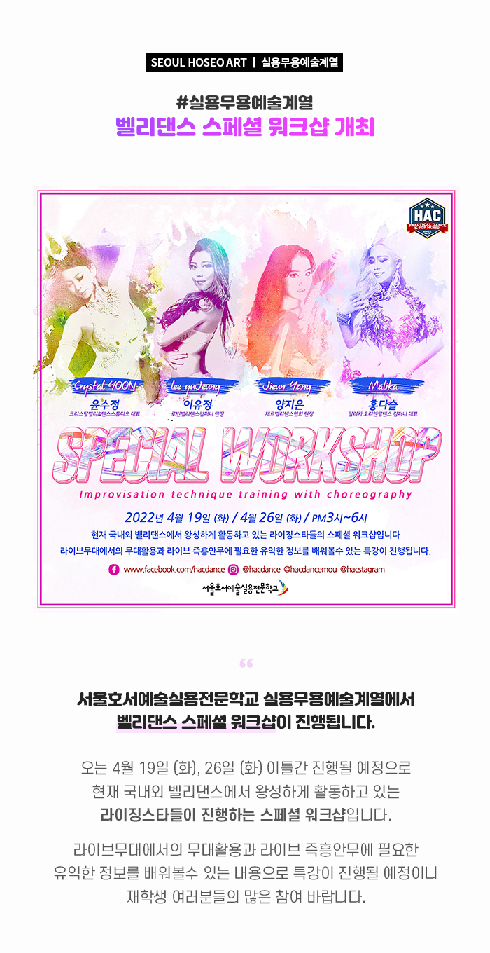 서울호서예술실용전문학교 실용무용예술계열에서 벨리댄스 스페셜 워크샵이 진행됩니다. 오는 4월 19일 (화), 26일 (화) 이틀간 진행될 예정으로 현재 국내외 벨리댄스에서 왕성하게 활동하고 있는 라이징스타들이 진행하는 스페셜 워크샵입니다.
