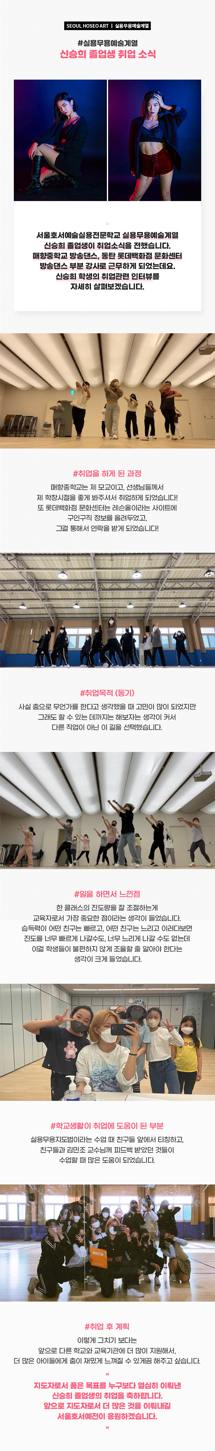 서울호서예술실용전문학교 실용무용예술계열 신승희 졸업생이 취업 소식을 전했습니다. 매향중학교 방송댄스, 동탄 롯데백화점 문화센터 방송댄스 부분 강사로 근무하게 되었는데요. 신승희 학생의 취업관련 인터뷰를 자세히 살펴보겠습니다. Q. 취업 과정 A. 매향중학교는 제 모교이고, 선생님들께서 제 학창시절을 좋게 봐주셔서 취업하게 되었습니다! 또 롯데백화점 문화센터는 레슨올이라는 사이트에 구인구직 정보를 올려두었고, 그걸 통해서 연락을 받게 되었습니다!