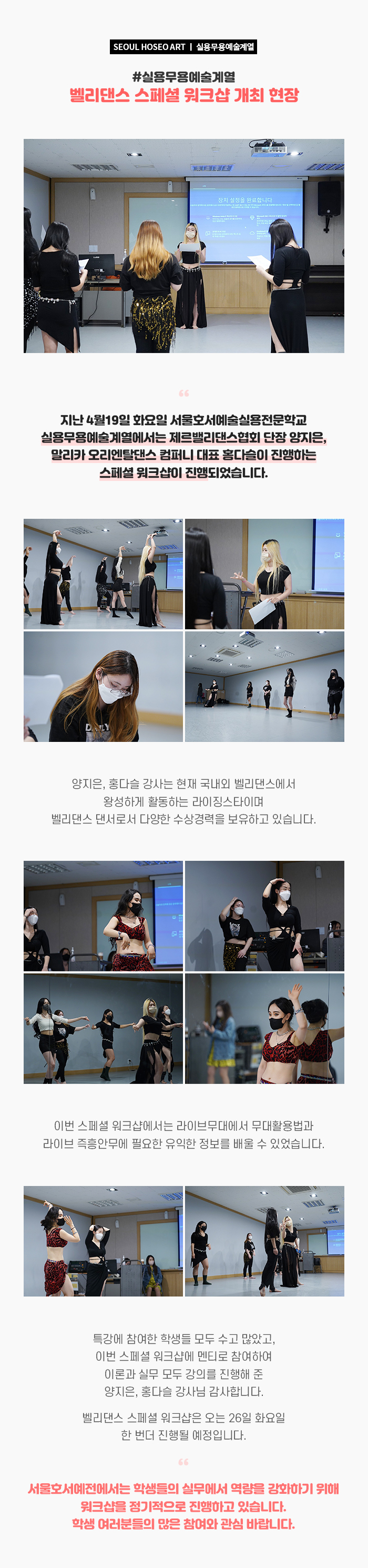 지난 4월19일 화요일 서울호서예술실용전문학교 실용무용예술계열에서는 제르밸리댄스협회 단장 양지은, 말리카 오리엔탈댄스 컴퍼니 대표 홍다슬이 진행하는 스페셜 워크샵이 진행되었습니다. 양지은, 홍다슬 강사는 현재 국내외 벨리댄스에서 왕성하게 활동하는 라이징스타이며 벨리댄스 댄서로서 다양한 수상경력을 보유하고 있습니다. 이번 스페셜 워크샵에서는 라이브무대에서 무대활용법과 라이브 즉흥안무에 필요한 유익한 정보를 배울 수 있었습니다.