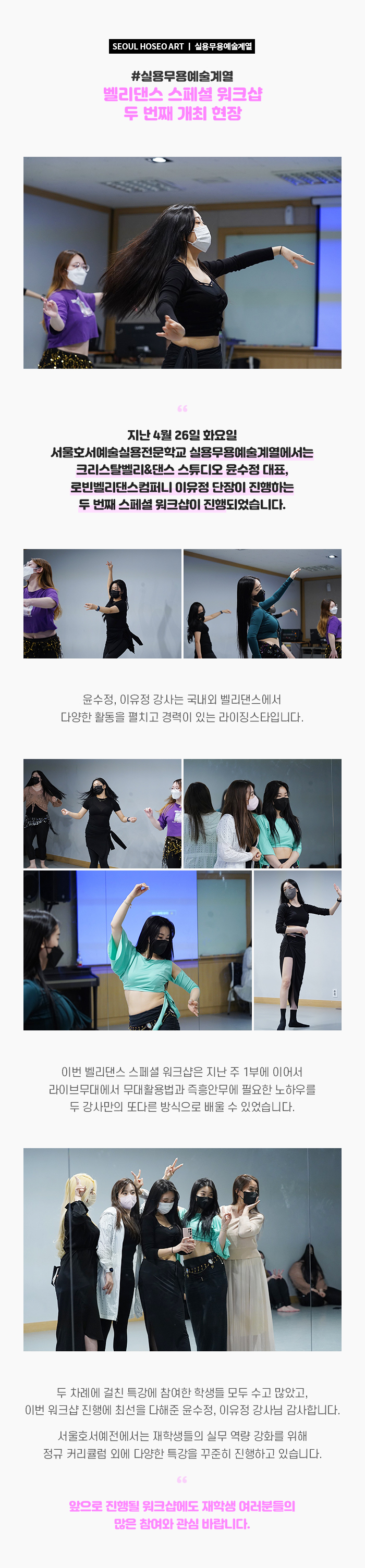 지난 4월 26일 화요일 서울호서예술실용전문학교 실용무용예술계열에서는 크리스탈벨리&댄스 스튜디오 윤수정 대표, 로빈벨리댄스컴퍼니 이유정 단장이 진행하는 두 번째 스페셜 워크샵이 진행되었습니다. 윤수정, 이유정 강사는 국내외 벨리댄스에서 다양한 활동을 펼치고 경력이 있는 라이징스타입니다.