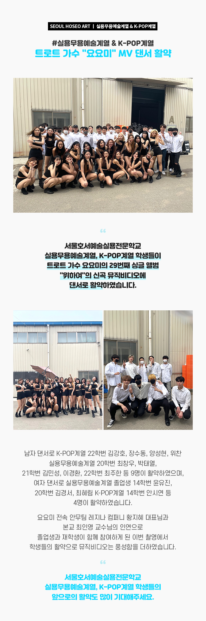 서울호서예술실용전문학교 실용무용예술계열, K-POP계열 학생들이 트로트 가수 요요미의 29번째 싱글 앨범 "위하여"의 신곡 뮤직비디오에 댄서로 활약하였습니다. 요요미 전속 안무팀 레지나 컴퍼니 황지혜 대표님과 본교 최인영 교수님의 인연으로 졸업생과 재학생이 함께 참여하게 된 이번 촬영에서 학생들의 활약으로 뮤직비디오는 풍성함을 더하였습니다.