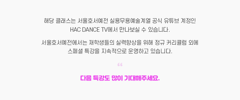 서울호서예술실용전문학교 실용무용예술계열 보깅클래스에서 졸업생 JUJU와 함께하는 스페셜 특강이 진행되었습니다. 학생들의 Ballroom에 나가기전 간단한 세션으로 먼저 접할 수 있는 뜻 깊은 수업이었고 의미있는 시간이었습니다.