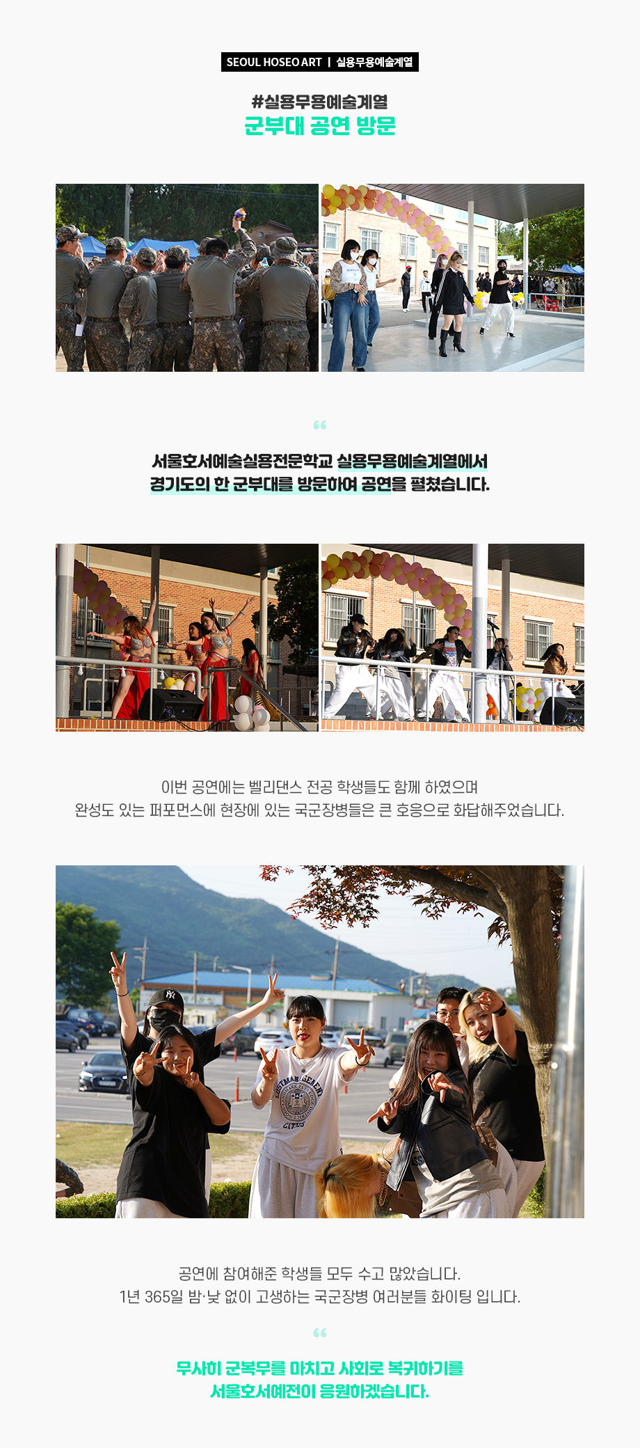서울호서예술실용전문학교 실용무용예술계열에서 경기도의 한 군부대를 방문하여 공연을 펼쳤습니다. 이번 공연에는 벨리댄스 전공 학생들도 함께 하였으며 완성도 있는 퍼포먼스에 현장에 있는 국군장병들은 큰 호응으로 화답해주었습니다.
