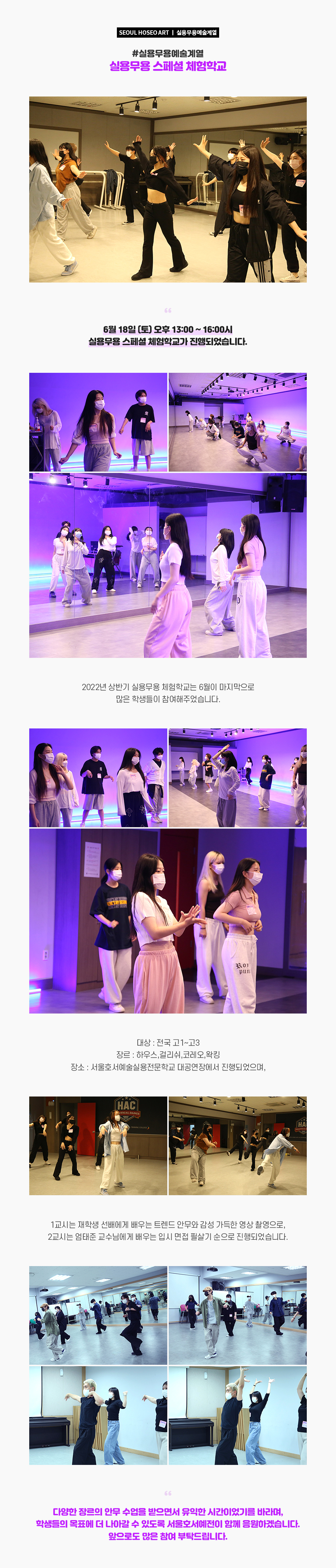 6월 18일 (토) 오후 13:00 ~ 16:00시 실용무용 스페셜 체험학교가 진행되었습니다. 2022년 상반기 실용무용 체험학교는 6월이 마지막으로 많은 학생들이 참여해주었습니다.