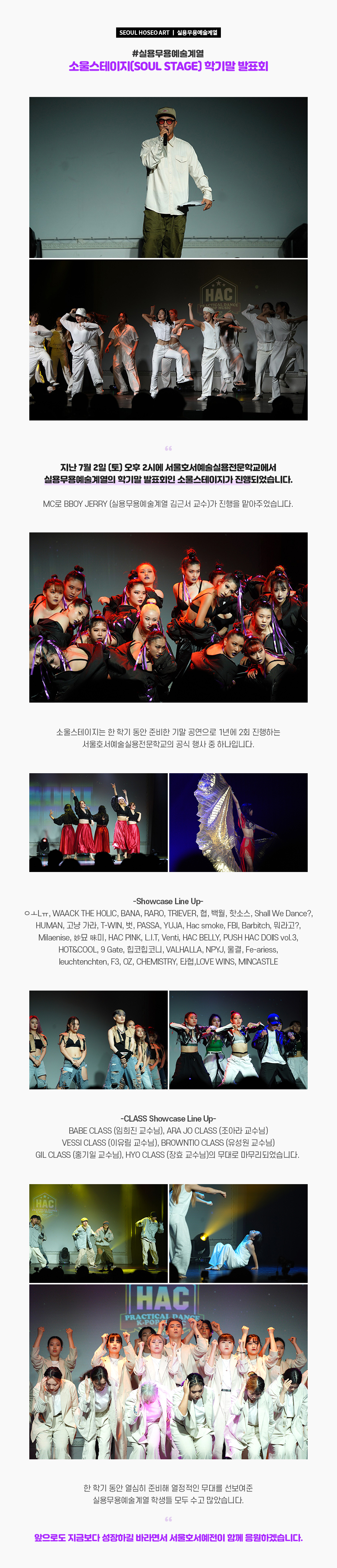 지난 7월 2일 (토) 오후 2시에 서울호서예술실용전문학교에서 실용무용예술계열의 학기말 발표회인 소울스테이지가 진행되었습니다. MC로 BBOY JERRY (실용무용예술계열 김근서 교수)가 진행을 맡아주었습니다. 소울스테이지는 한 학기 동안 준비한 기말 공연으로 1년에 2회 진행하는 서울호서예술실용전문학교의 공식 행사 중 하나입니다.