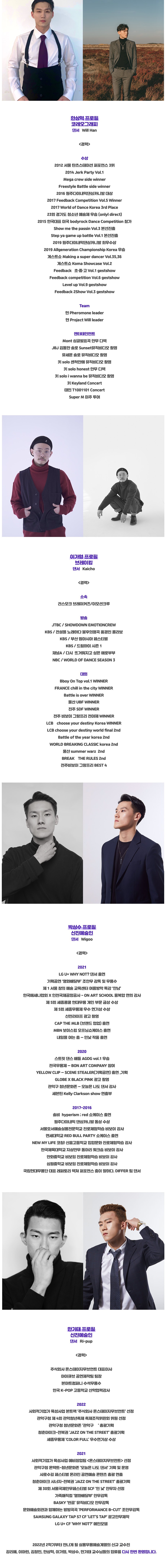 2022년 2학기 실용무용예술계열 신규 교수님들을 소개합니다. 걸리쉬 강리예, 이아린교수님, 코레오그래피 김창민, 한상혁교수님, 브레이킹 이가형교수님, 신진예술인 박상수, 한기태교수님! 환영합니다.