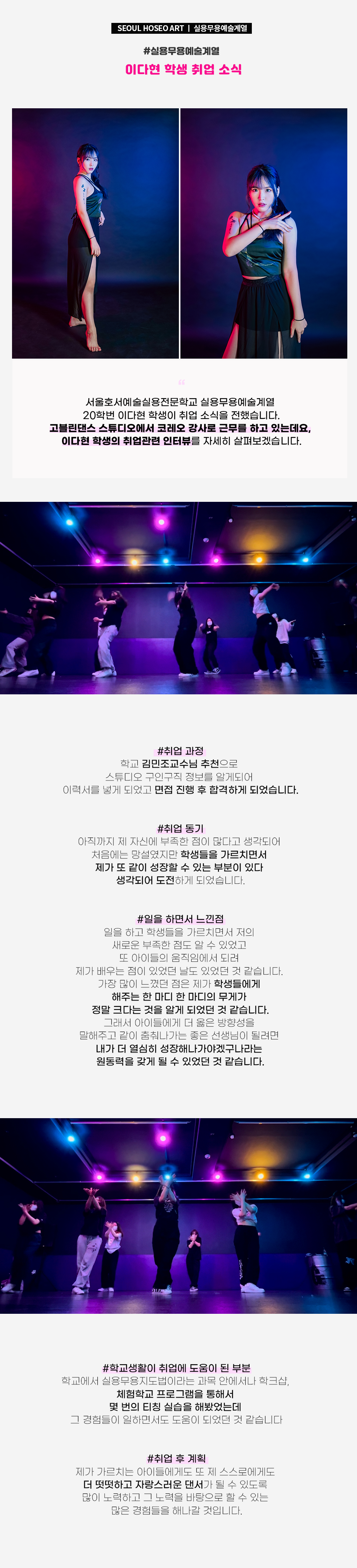 서울호서예술실용전문학교 실용무용예술계열 20학번 이다현 학생이 취업 소식을 전했습니다. 고블린댄스 스튜디오에서 코레오 강사로 근무를 하고 있는데요, 이다현 학생의 취업관련 인터뷰를 자세히 살펴보겠습니다.