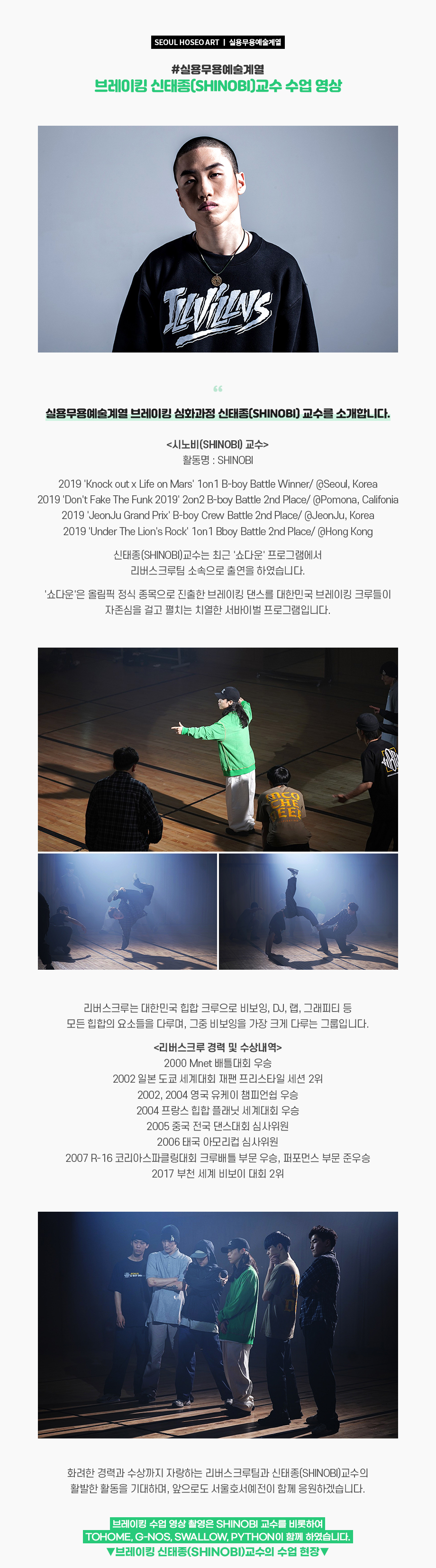 심화과정/브레이킹 신태종(SHINOBI) 교수를 소개합니다. 신태종(SHINOBI)교수는 최근 '쇼다운' 프로그램에서 리버스크루팀 소속으로 출연을 하였습니다. '쇼다운'은 올림픽 정식 종목으로 진출한 브레이킹 댄스를 대한민국 브레이킹 크루들이 자존심을 걸고 펼치는 치열한 서바이벌 프로그램입니다.