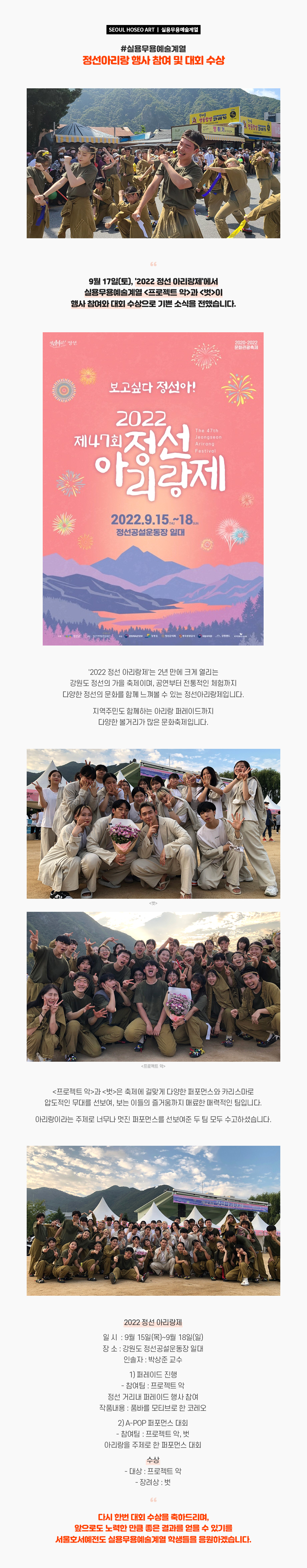 9월 17일(토), '2022 정선 아리랑제'에서 실용무용예술계열 <프로젝트 악>과 <벗>이 행사 참여와 대회 수상으로 기쁜 소식을 전했습니다. '2022 정선 아리랑제'는 2년 만에 크게 열리는 강원도 정선의 가을 축제이며, 공연부터 전통적인 체험까지 다양한 정선의 문화를 함께 느껴볼 수 있는 정선아리랑제입니다. 지역주민도 함께하는 아리랑 퍼레이드까지 다양한 볼거리가 많은 문화축제입니다.